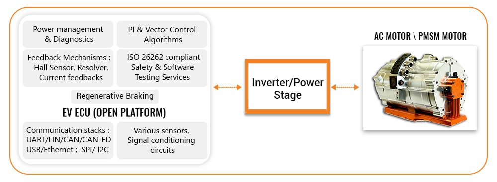 - Algorithms like Field-oriented control, regenerative braking, field-weakening etc. are installed in the MCU platform.